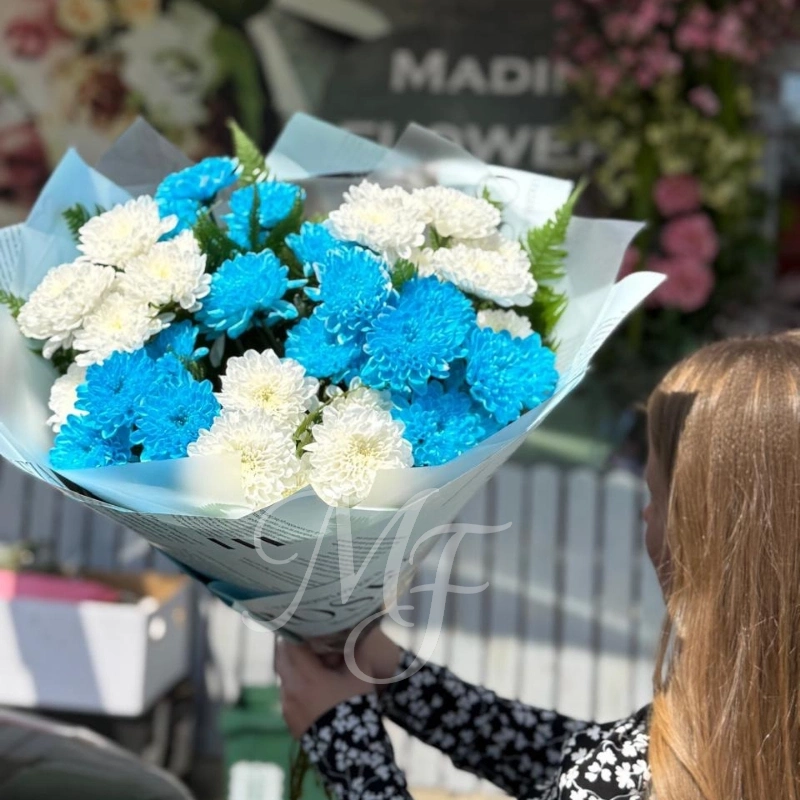 Букет из белых и синих хризантем, элегантно упакованный в белую бумагу с голубой отделкой, излучает свежесть и нежность. Сочетание цветов создает воздушную и спокойную композицию, идеальную для подарка или украшения интерьера. Этот букет станет прекрасным выражением заботы и внимания.
