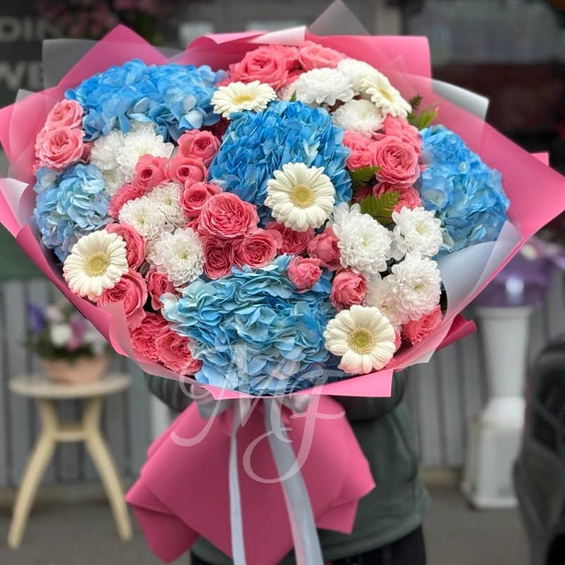 Букет, состоящий из голубых гортензий, белых хризантем, белых гербер и розовых роз, создает свежий и нежный образ. Необычные голубые оттенки гортензий придают композиции оригинальность, а классические розы добавляют романтичности.